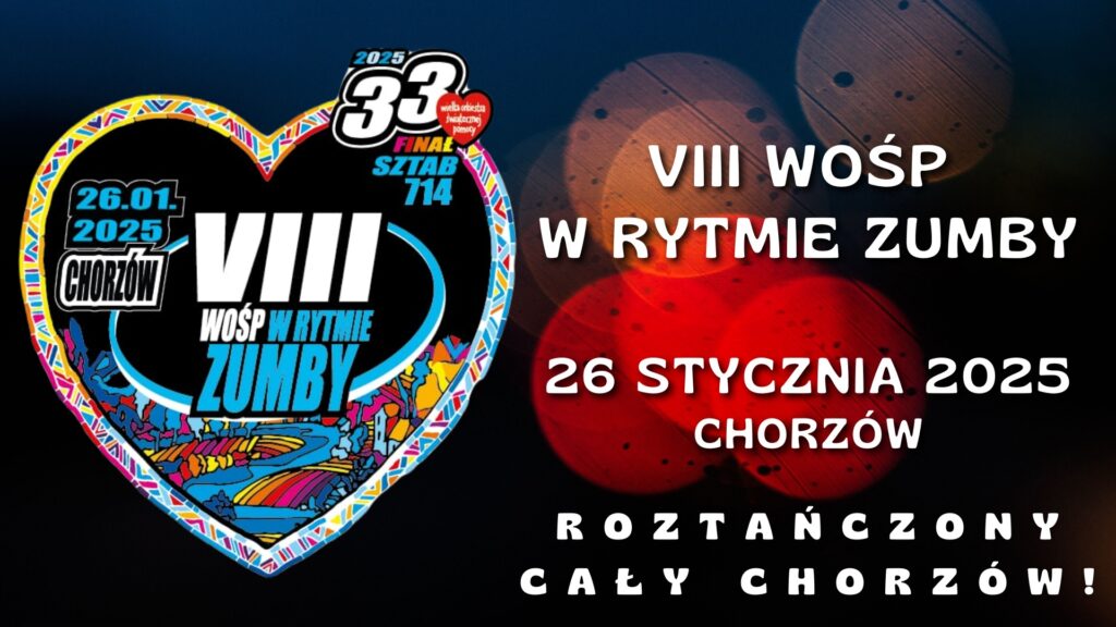 Z radością zapraszamy Cię na VIII WOŚP w rytmie zumby w Chorzowie, który odbędzie się 26 stycznia 2025 r., w siedzibie naszego sztabu tj. ul. Sportowa 23, w Chorzowie! Zajęcia będą przeprowadzone przez wykwalifikowanych instruktorów zumby!